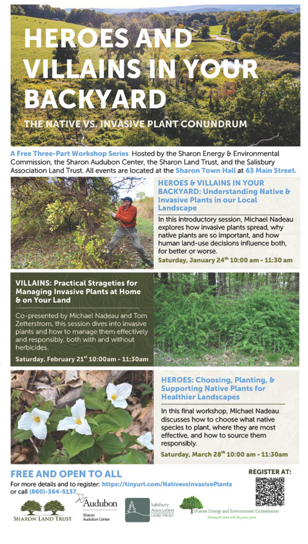 Join us Saturday, January 24th at 10:00am at the Sharon Town Hall for the first workshop of a FREE three-part series hosted by the Sharon Energy & Environmental Commission, the Sharon Audubon Center, the Sharon Land Trust, and the Salisbury Association Land Trust. In this introductory session, Michael Nadeau will explore what defines a “hero” and a |